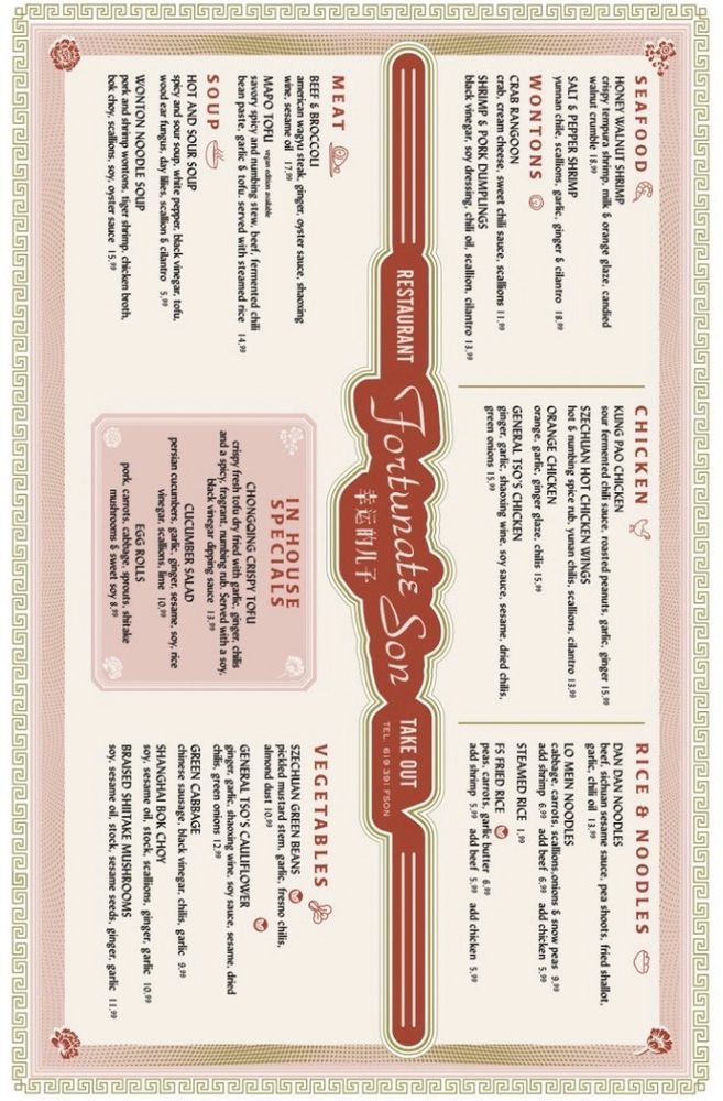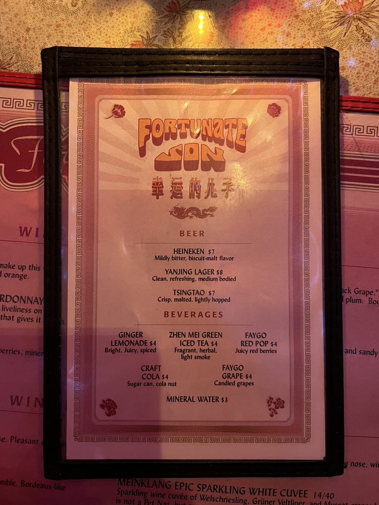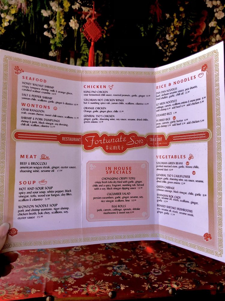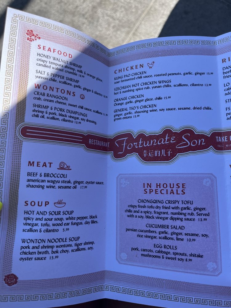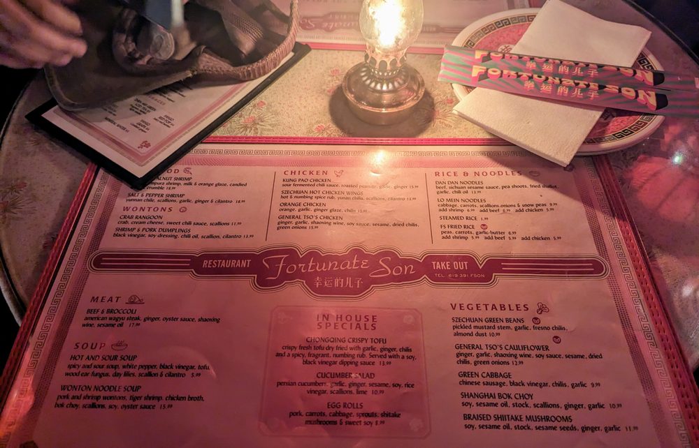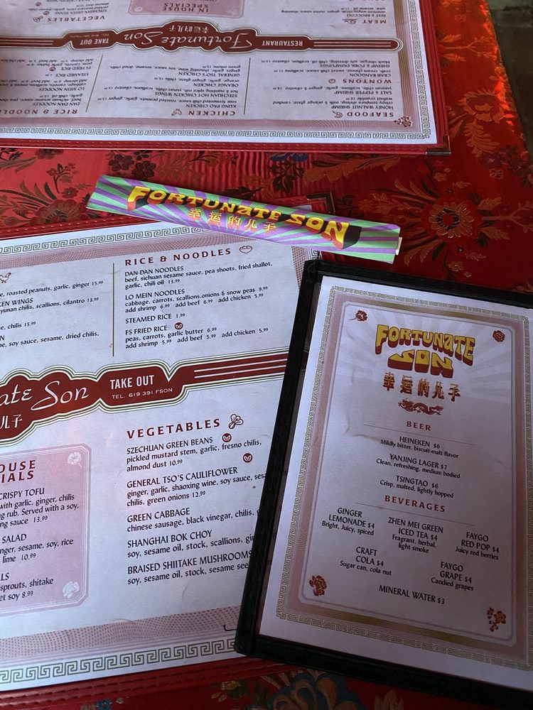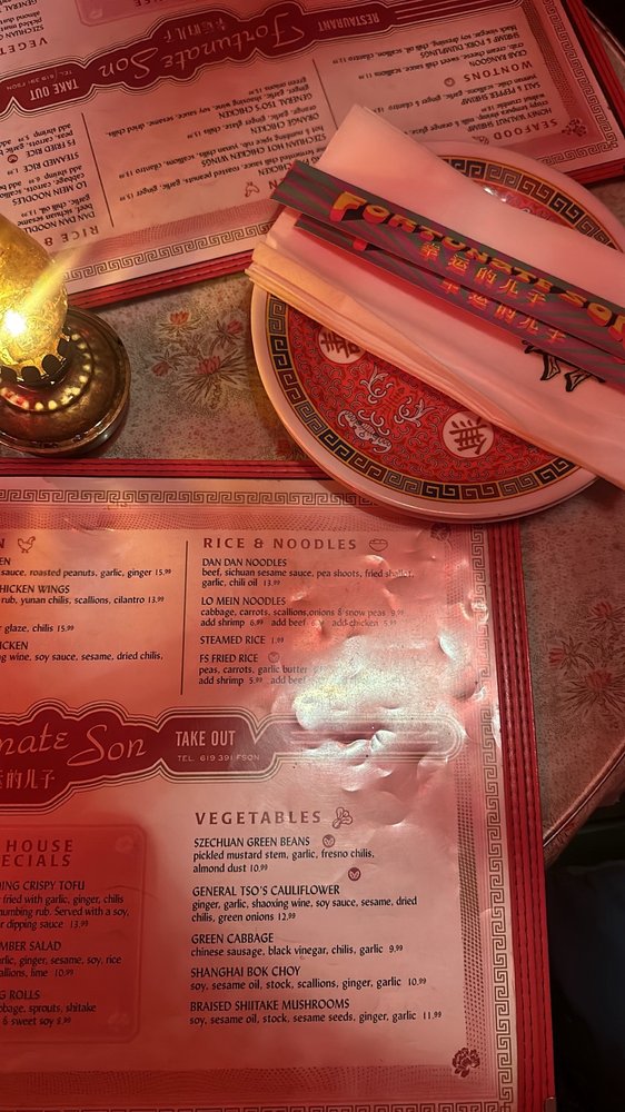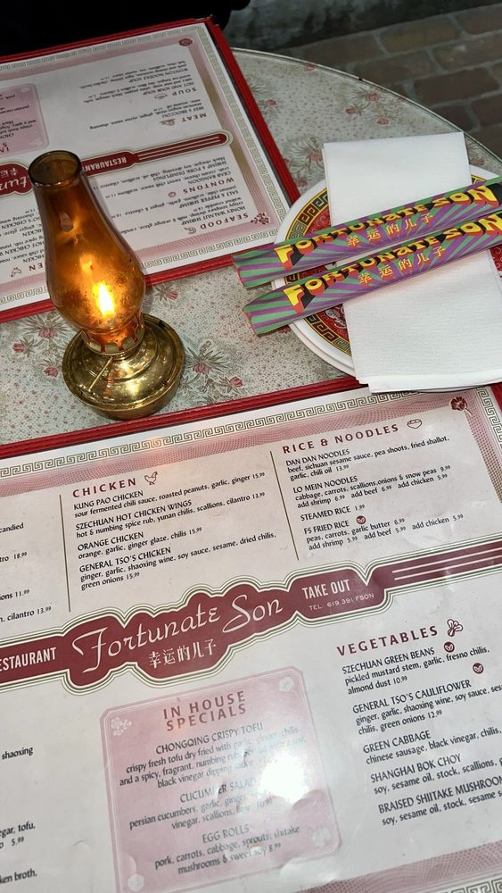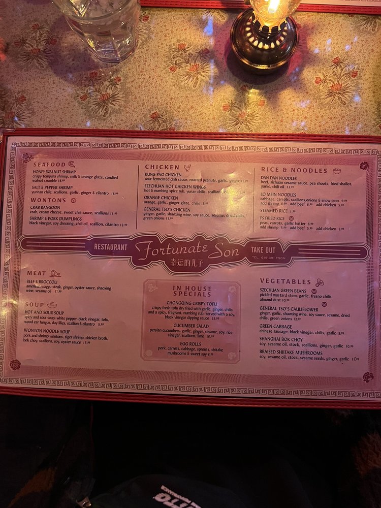 Introducing the menu at Fortunate Son, a trendy Chinese noodle spot in San Diego, offers a variety of dishes perfect for sharing. The ambiance is intimate and Instagram-worthy with lanterns, Asian furniture, and a touch of tradition. The menu, although small, features family-style Chinese cuisine with generous portions. Standout dishes like crispy tofu, honey walnut shrimp, and crab Rangoon are highly recommended by satisfied customers. The prices are fair, and the service is attentive, making for an enjoyable dining experience. While some dishes may be hit-or-miss, the overall vibe and decor make Fortunate Son a solid choice for a unique dining experience. The restaurant's popularity leads to wait times, so making reservations is recommended to secure a spot at this cozy and inviting eatery.